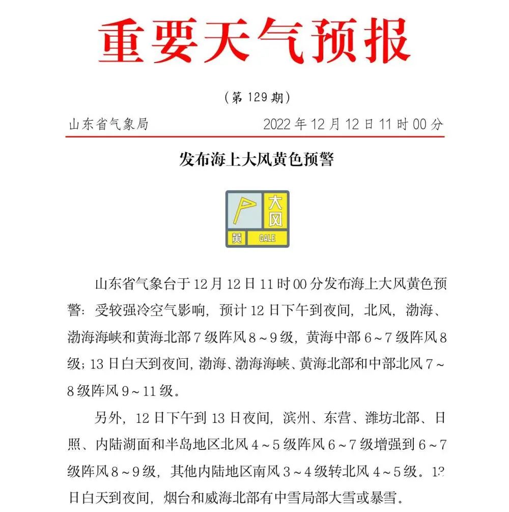 另外,12日下午到13日夜間,濱州、東營、濰坊北部、日照、內陸湖面和半島地區北風4~5級陣風6~7級增強到6~7級陣風8~9級,其他內陸地區南風3~4級轉北風4~5級。