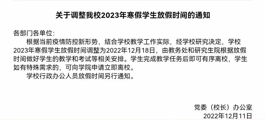 根據當前疫情防控新形勢,結合學校教學工作實際,經學校研究決定,學校2023年寒假學生放假時間調整為2022年12月18日 ,由教務處和研究生院根據放假時間做好學生的教學和考試等相關安排。學生完成教學任務後即可有序離校,學生如有特殊需求的,可向學院申請立即離校。