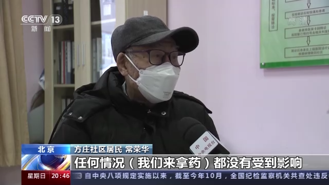 *方莊社區居民 常榮華:*任何情況我們來拿藥都沒有受到影響,我們是按月拿藥,疫情嚴重的時候就拿兩個月的長處方。社區會給一個預約掛號單,提醒我們下個月哪一天再來拿藥正合適。剛開始對這個病不瞭解,確實害怕,現在通過專家和電視台的講解,包括社區醫院醫生給我們發微信講解,我知道奧密克戎在減輕毒性。醫生會用微信指導我們,吃什麼藥到這來開,怎麼喝水,怎麼休息,現在我不怕了。