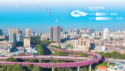 城市立交橋,見證着顯著提升的發展速度。新時代十年,全國城市橋樑數由2012年的5.76萬餘座增至2021年的8.36萬餘座,其中立交橋數量由4048座增至6107座,為暢通城市交通、完善城市路網結構奠定了堅實基礎。