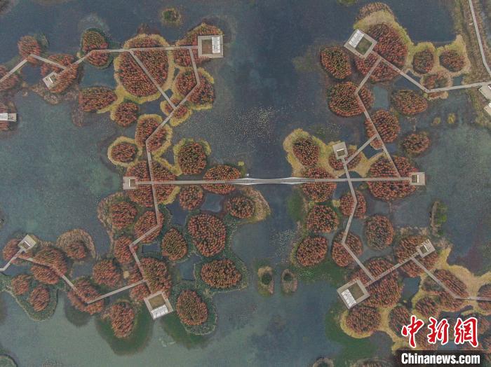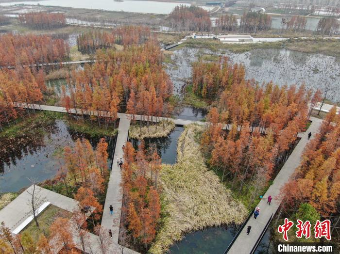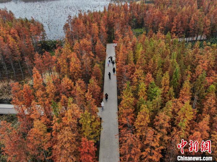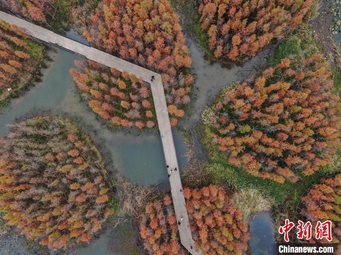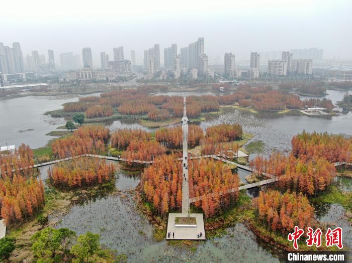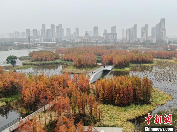圖為航拍魚尾洲公園內的水杉、香樟、落羽杉、池杉等樹木層林盡染,宛若一座秀美“漂浮森林”。 劉力鑫 攝
