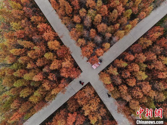 圖為航拍魚尾洲公園層林盡染,一些市民漫步其中,享受悠閒週末。 劉力鑫 攝
