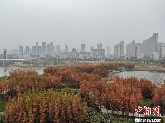 圖為航拍魚尾洲公園內的水杉、香樟、落羽杉、池杉等樹木層林盡染,宛若一座秀美城市“漂浮森林”。 劉力鑫 攝