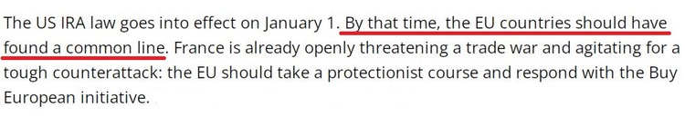 上週末,西班牙、法國、意大利、葡萄牙等9個歐盟地中海國家的領導人在西班牙阿利坎特舉行會議,一致認為美國的《通脹削減法案》是保護主義政策,有損歐洲產業發展,要求歐盟對其作出共同的“強烈回應”。