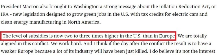 他在採訪中對美國的《通脹削減法案》大加抨擊:“現在美國(對電動車等相關綠色產業)的補貼水平是歐洲的兩到三倍……我認為,如果俄烏衝突的結果是讓歐洲變得更弱,這不符合美國政府甚至美國社會的利益”。