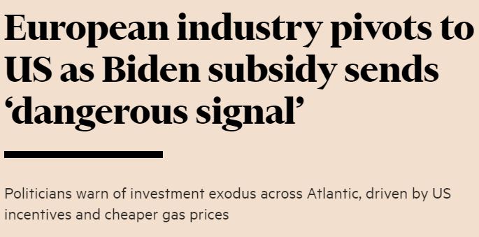 英國《金融時報》:美國低廉的能源價格和《通脹削減法案》中的補貼政策吸引歐洲企業將生產線轉移至美