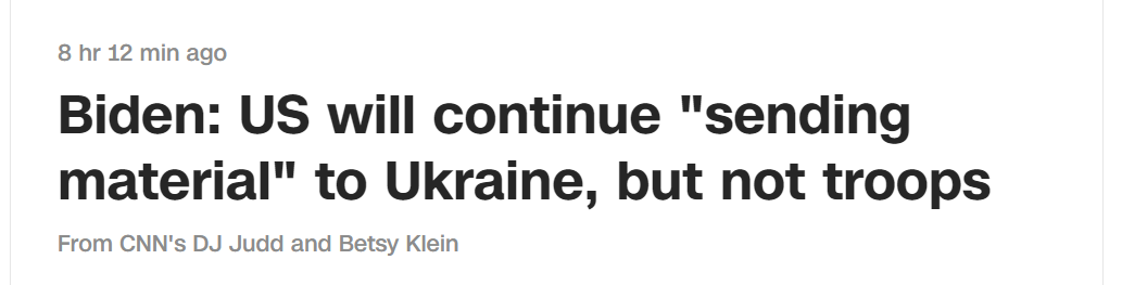 報道説,拜登是在弗吉尼亞州阿靈頓邁爾-亨德森陸軍聯合基地舉行的一場活動中做出這一表態的。據白宮官網實錄,當被隨行記者問及“你會派美軍士兵去烏克蘭嗎”,拜登重複了一遍記者的提問,然後回答説,“不。我們像以往一樣援助物資。價值數十億美元。”
