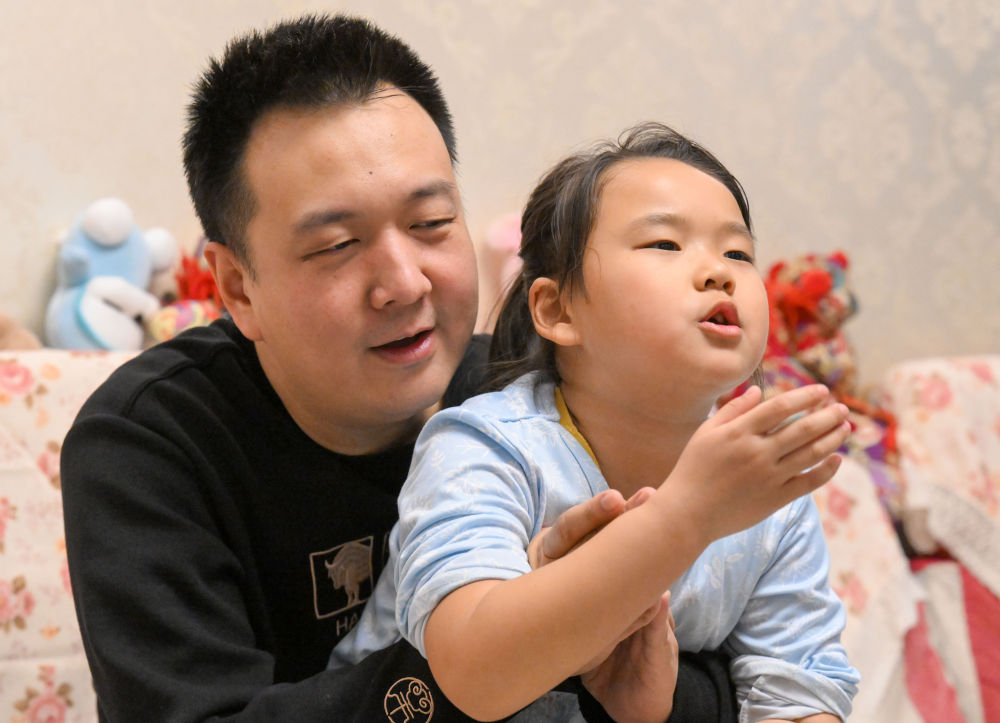 ↑蔡成(右)指導女兒蔡佳瀅練習打快板(11月29日攝)。