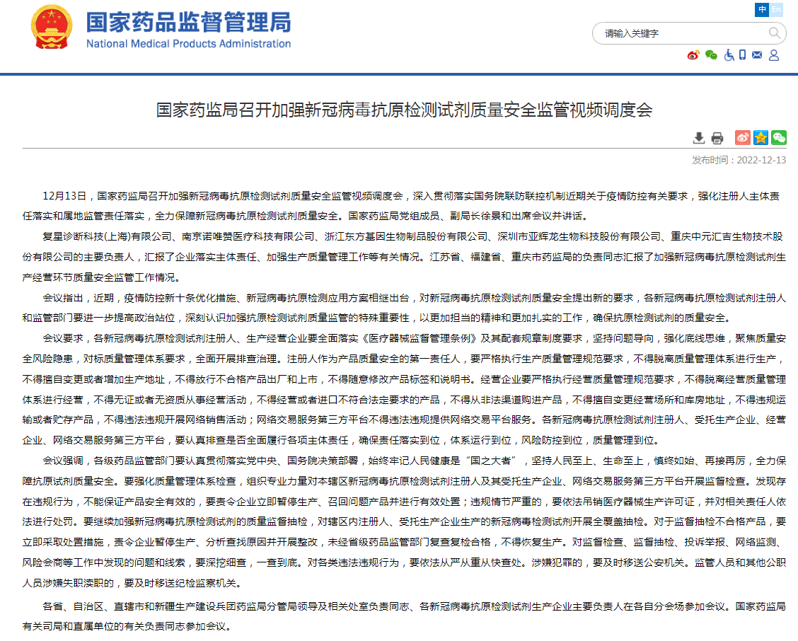 12月13日,國家藥監局召開加強新冠病毒抗原檢測試劑質量安全監管視頻調度會,深入貫徹落實國務院聯防聯控機制近期關於疫情防控有關要求,強化註冊人主體責任落實和屬地監管責任落實,全力保障新冠病毒抗原檢測試劑質量安全。國家藥監局黨組成員、副局長徐景和出席會議並講話。