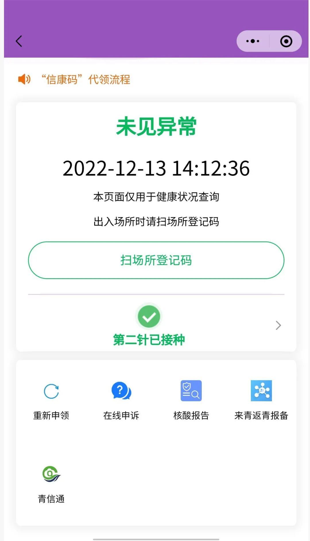 根據國務院聯防聯控機制綜合組發佈《關於進一步優化落實新冠肺炎疫情防控措施的通知》和我省新冠肺炎疫情防控處置工作指揮部印發《關於貫徹進一步優化落實新冠肺炎疫情防控措施的意見》,“青海信康碼”及時依規取消“兩站一場”等重點場所的“落地檢”彈窗等功能。