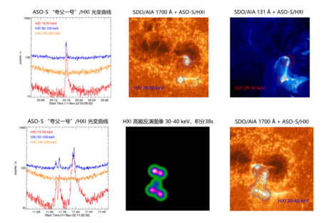 圖3和圖4分別展示了太陽硬X射線成像儀(HXI)在2022年11月11日觀測到的“雙11”系列耀斑的硬X射線成像結果與AIA/SDO同時觀測到的紫外1700埃圖像的比較、耀斑硬X射線光變及硬X射線成像與AIA/SDO的極紫外/紫外圖像的合成圖。從圖中可以清楚看到,硬X射線源的位置與紫外亮結構的位置在高空間分辨率下完美重合,特別值得注意的是,HXI具有對複雜源的成像能力,成像的可靠性得到了充分確認。