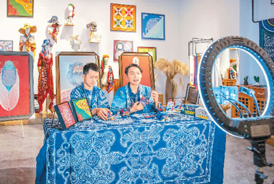 在第132屆中國進出口商品交易會上,貴州省黔東南苗族侗族自治州施秉縣舞水雲台旅遊商品開發有限公司通過線上產品展示及廣交會直播等方式,攜4個品類60餘種類別的民族刺繡工藝品、刺繡家居裝飾畫系列文創產品參會。圖為公司員工在線上直播平台推銷苗繡旅遊產品。