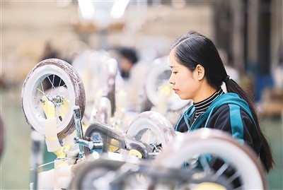 河北省邢台市平鄉縣通過進一步完善外貿企業幫扶制度、構建政企交流平台、支持跨境電商企業擴大出口規模等措施,引導外貿企業集聚發展。圖為平鄉縣一家兒童用品公司員工在趕製童車出口訂單產品。