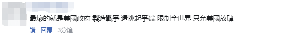 還有人批評稱,“最壞的就是美國政府,製造戰爭,還挑起爭端,限制全世界,只允美國放肆。”“所以説美國是最邪惡的國家。蔡因文一路抱美國大腿。就是同路人。” ↓