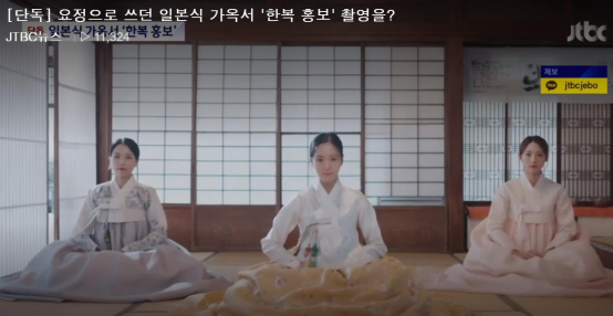 據報道,近日,由韓國文化體育觀光部和釜山市政府贊助拍攝的一則韓服宣傳片被正式公開。但JTBC電視台方面發現,相關視頻的拍攝場地不是傳統韓屋,而是日式建築。