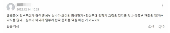 更有一位網民結合今年韓國政府多次“親日”行為表示:“今年以來韓國文化體育觀光部有關‘日本文化’的‘失誤’怎麼就這麼多呢?在首爾光化門廣場掛出‘旭日旗’海報;還要重建日本總督府……在我看來,這些都不是‘失誤’,而是在有意抹黑韓國文化!”↓