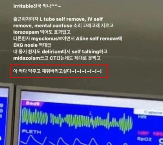 根據這名患者家屬提供的信息,該護士在一張看似是重症監護室房間的照片上配文稱,“接管病人兩個月後,現在兩小時就送他歸西”;此外,她還在另一張照片中寫道,“從我一上班起(患者)就大吼大叫,吃藥也沒用”,“真想把藥一次性都給他灌進去,讓他睡覺”。不僅如此,面對一位戴着人工呼吸機面罩,呼吸困難而打嗝不止的老年患者,她竟然説:“想讓老人暫時停止呼吸。要不要拔下呼吸機呢?可能會沒命哦。”