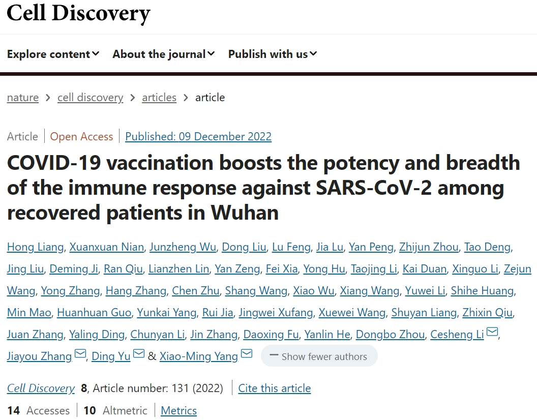 【環球時報-環球網報道 記者 樊巍】2022年12月09日,國際頂級學術期刊《Cell Discovery》雜誌上發佈一項關於武漢地區新冠康復者兩年後的免疫變化,以及接種滅活疫苗後能夠維持長期免疫力的研究結果。*研究表明,**康復者接種滅活疫苗後,激發機體產生更廣泛的抗體譜,可有效中和新冠突變株,同時誘導機體產生針對新冠病毒的多功能記憶性T細胞。*此前多項研究也表明,廣泛的抗體譜可產生對新冠病毒突變株的交叉保護作用,有效地中和德爾塔與奧密克戎等突變株。因此,新冠康復者仍應積極接種奧密克戎株新冠滅活疫苗,以產生長期免疫能力,同時滅活疫苗可以激活康復者的記憶CD4+ T細胞識別突變株表位並快速產生免疫應答,即使感染了新冠病毒仍可以迅速產生保護。