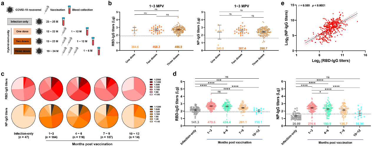 本研究共納入448例新冠康復者,所有的康復者均沒有出現再次感染,其中401例在康復1年或更長的時間後接種了1-3針不等的新冠滅活疫苗。新冠康復者康復2年後,在沒有再次抗原暴露的情況下,其新冠特異性抗體RBD-IgG(抗新冠病毒受體結合域抗體)與NP-IgG(抗新冠病毒核衣殼抗體)滴度非常低。這也導致新冠康復者基本喪失了對新冠突變株,包括德爾塔以及奧密克戎譜系(BA.1,BA.2,BA.5等)的抵抗能力。