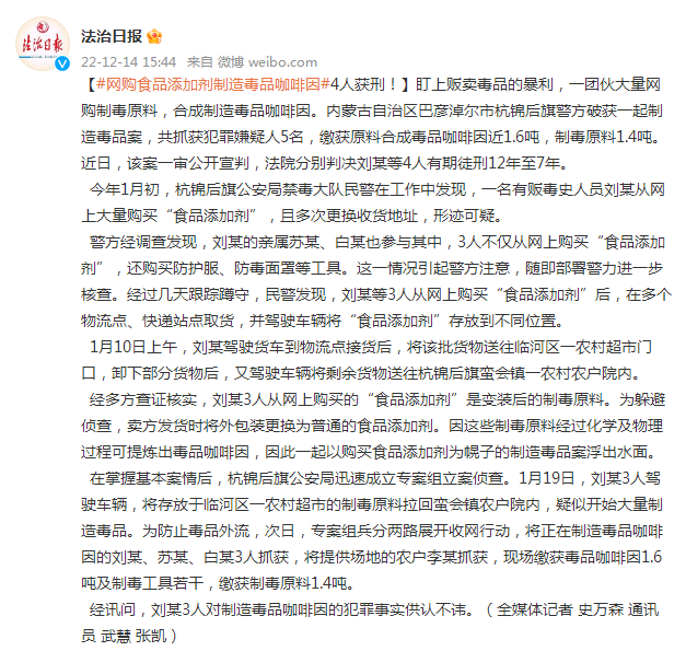 網購食品添加劑製造毒品咖啡因,4人獲刑!