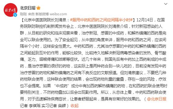 12月14日,在國務院聯防聯控機制新聞發佈會上,北京中醫醫院院長劉清泉介紹,針對新冠感染的人羣,從目前的研究和臨牀觀察來看,治療新冠、感冒的中成藥,和解熱鎮痛的西藥是完全可以聯合使用的。為了安全起見,從中醫的角度來講,服用中藥和西藥之間,應該間隔半個小時,這樣安全性更大。中藥和西藥,尤其治療感冒的中藥的和解熱鎮痛的西藥之間能起到互補的作用,能夠比較快、比較持久地解決新冠病毒感染者的發熱、骨節痠痛、乏力、咽喉疼痛和咳嗽等症狀。近幾十年來,我國先後有中藥加上西藥製成的中成藥,是治療感冒的很好的藥物,這實際上是兩種藥合到一塊兒吃的,目前沒有發現中藥治療感冒的藥物和解熱鎮痛藥之間有不良反應的文獻報道。但劉清泉建議,不要把幾種藥物聯合使用,這種聯合使用的結果,會出現藥物劑量的重疊,存在一定的風險,療效也不會提高。如果 “中成藥”成分中有加西藥解熱鎮痛的藥物,在和西藥的聯合使用時要特別關注,不然藥物疊加以後會出現副作用。所以,從總體上看,中藥和西藥聯合使用,對於迅速解除疾病症狀,讓患者舒服起來,是具有非常好的效果的。