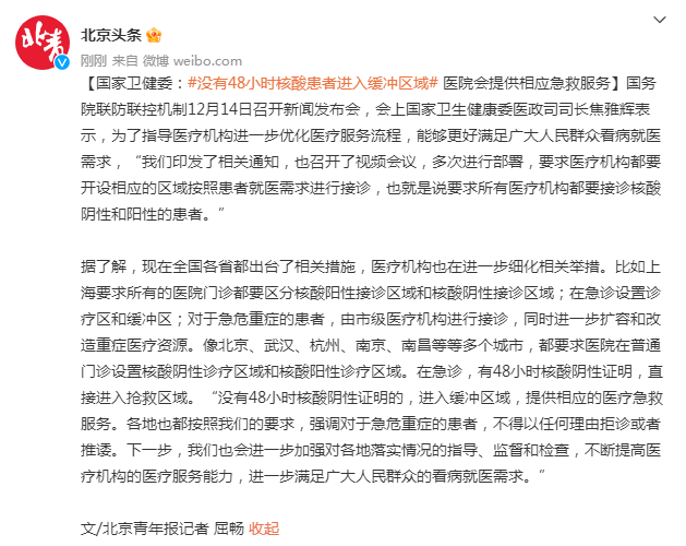 國家衞健委:沒有48小時核酸患者進入緩衝區域 醫院會提供相應急救服務