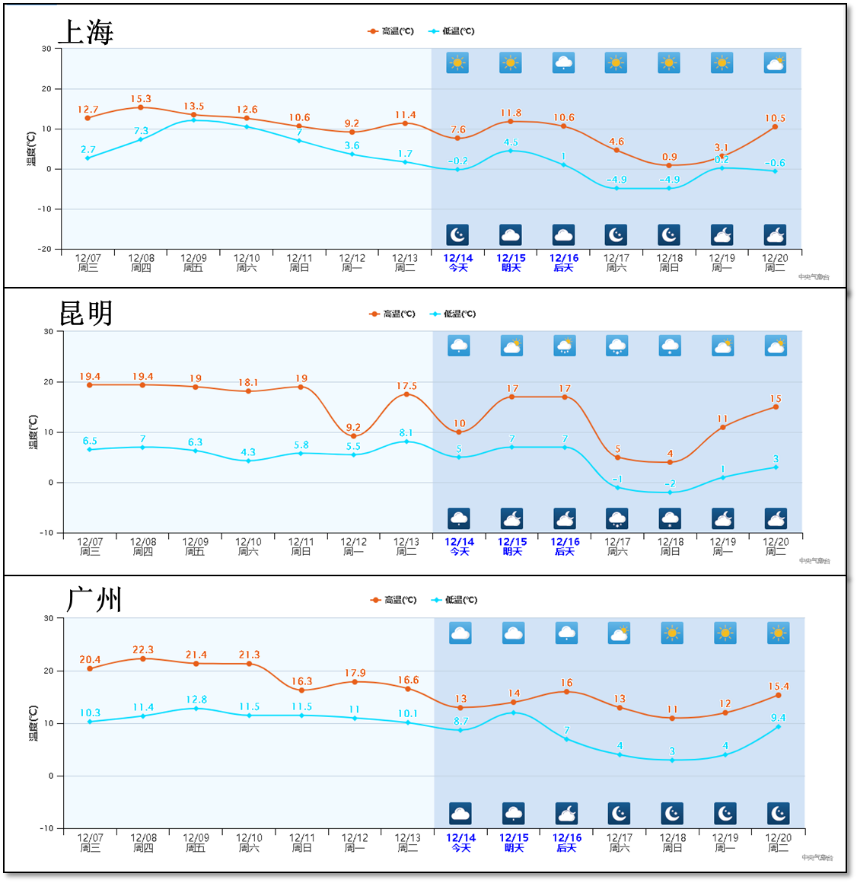 *14日上午中央氣象台開始**發佈寒潮藍色預警:預計,*12月14日14時至12月16日20時,新疆、內蒙古中西部、西北地區東部、華北北部和西部、江漢東部以及江淮西部等地區將先後降温6~8℃,其中,新疆北疆沿天山地區和東部、內蒙古中部、甘肅東部、寧夏北部、山西北部、河北北部等地部分地區降温可達10℃以上。12月16日早上最低温度0℃線將位於秦嶺-淮河一帶,並將繼續向南方地區推進。期間,新疆北部、西北地區中東部、華北、黃淮等地有4~6級西北風,陣風7~9級;我國東部和南部海域將有7~9級風,部分海域陣風可達10~11級。