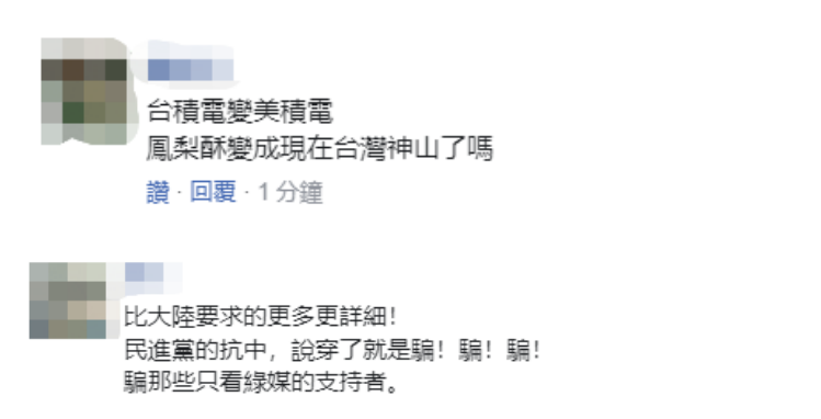在台媒評論區,也有人評論説,“台積電變美積電,鳳梨酥變成現在台灣神山了嗎?”“比大陸要求的更多更詳細!民進黨的‘抗中’,説穿了就是騙!”↓