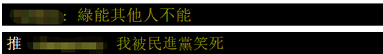 在“kaky”的帖文下方,也有網友留言表示,“綠能其他人不能。”“我被民進黨笑死。”↓
