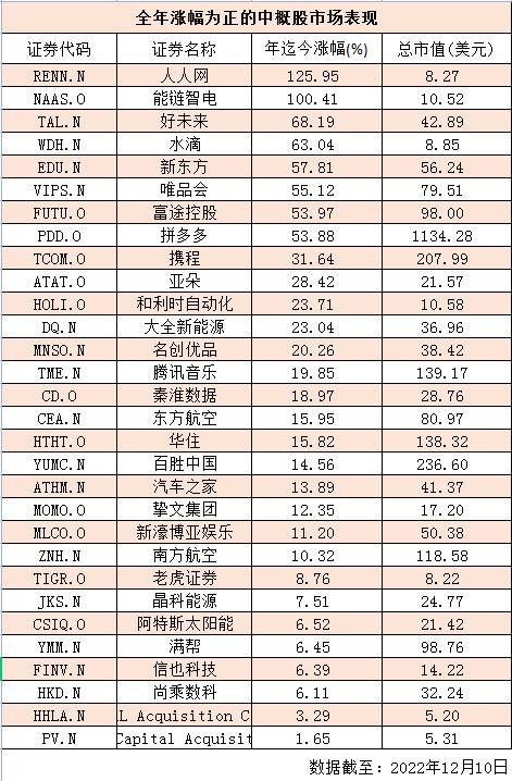 儘管今年以來赴美中概股上市明顯放緩,但從全年來看,依然有企業扛住市場震盪,實現股價反彈甚至翻倍增長。人人網、能鏈智電年內漲幅分別為128.54%、100.41%,另有水滴、富途控股、拼多多、新東方、唯品會、好未來漲幅超過50%。