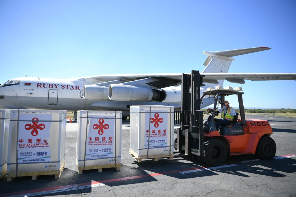 2021年12月24日,在尼加拉瓜馬那瓜國際機場,工作人員轉運由中國國藥集團生產的新冠疫苗。新華社記者辛悦衞攝