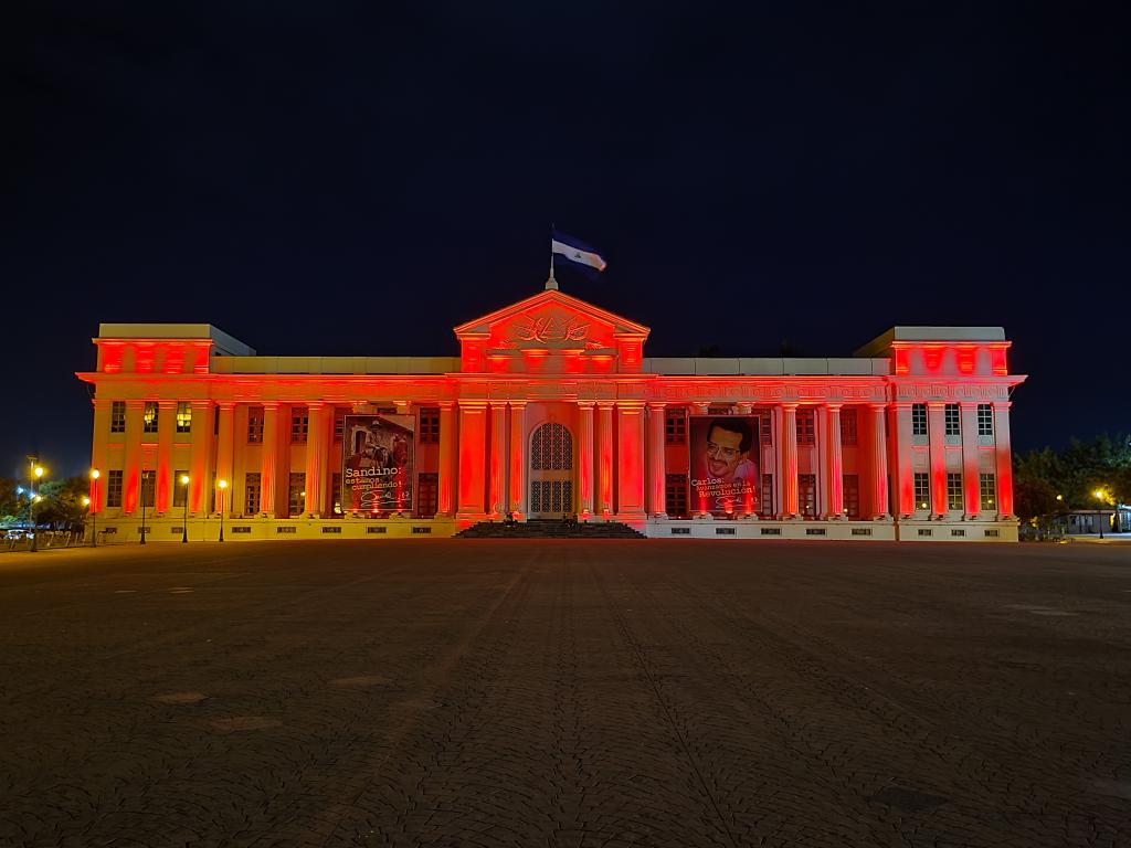 2022年1月31日,尼加拉瓜首都馬那瓜市中心標誌性建築國家宮點亮“中國紅”。新華社發(中國駐尼加拉瓜使館供圖)