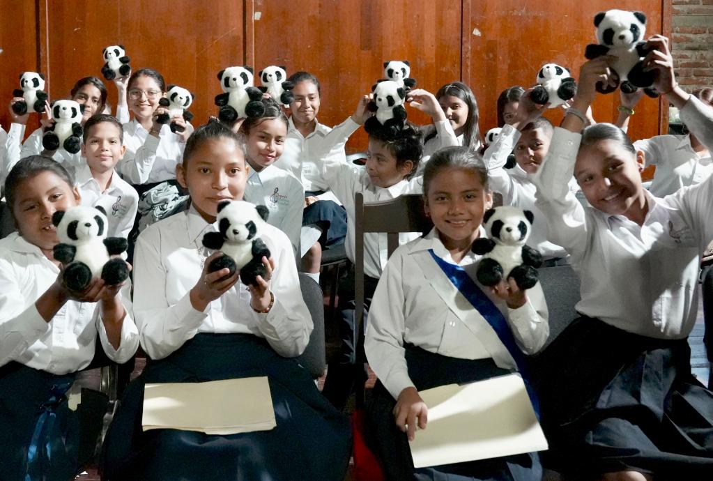 12月8日,在位於尼加拉瓜首都馬那瓜的國家劇院,參加慶祝中尼復交一週年專場音樂會的學生手捧熊貓玩偶。新華社記者席玥攝