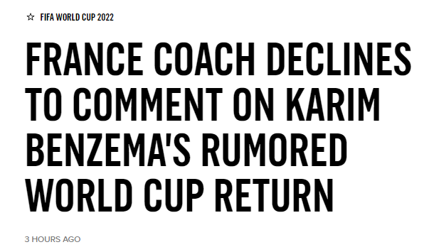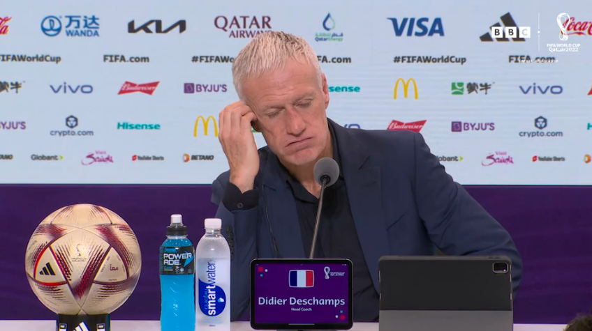 福克斯體育頻道提到,14日法國隊擊敗摩洛哥隊的賽後新聞發佈會上,該媒體向法國隊主帥德尚詢問關於“本澤馬迴歸世界盃”一事,後者禮貌地拒絕評論,但也沒有否認。“我真的不想回答這個問題,”德尚停了一會説,“下一個問題,我(為此)道歉。”