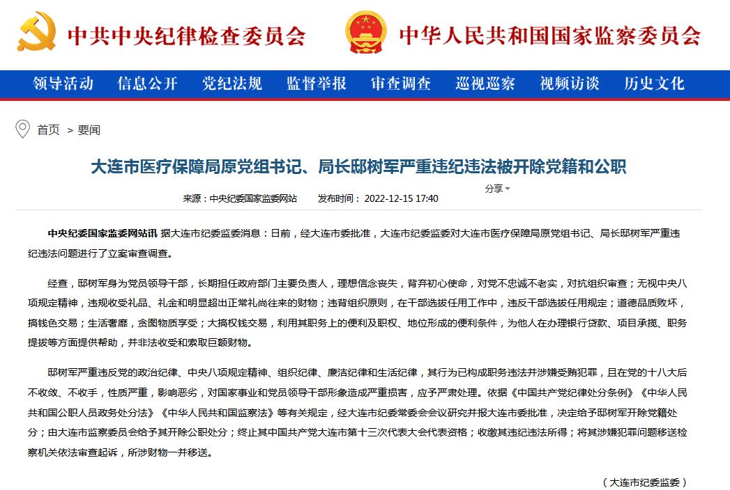 大連市醫療保障局原黨組書記、局長邸樹軍嚴重違紀違法被開除黨籍和公職