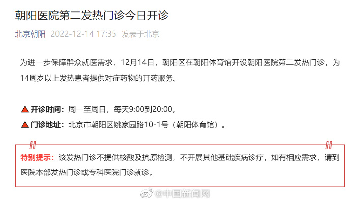 14日,朝陽區在朝陽體育館開設朝陽醫院第二發熱門診,每日早9點至晚8點接診。為14週歲以上發熱患者提供對症藥物的診療和開藥服務。朝陽區衞健委、朝陽醫院、朝陽區體育局和屬地六里屯街道辦事處現場辦公。