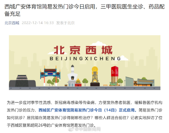 14日,西城區廣安體育館簡易發熱門診正式啓用,每日10:00—22:00接診。開診當天,駐區三甲醫院宣武醫院、北京大學人民醫院以及廣外醫院、復興醫院率先進駐。