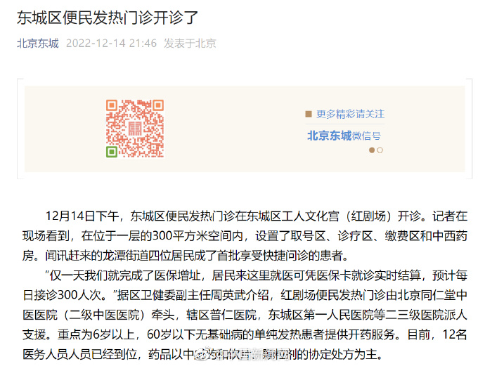 14日下午,東城區便民發熱門診在東城區工人文化宮(紅劇場)開診。紅劇場便民發熱門診由北京同仁堂中醫醫院(二級中醫醫院)牽頭,轄區普仁醫院,東城區第一人民醫院等二三級醫院派人支援。