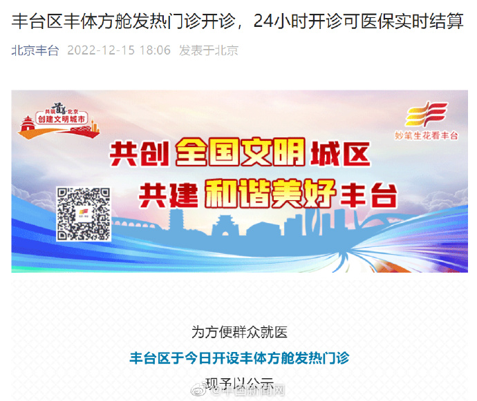 15日,豐台區豐體方艙發熱門診開診,全天24小時開診。主要服務16-65週歲,無基礎疾病,非急診、無有創治療的普通上呼吸道感染髮熱患者。