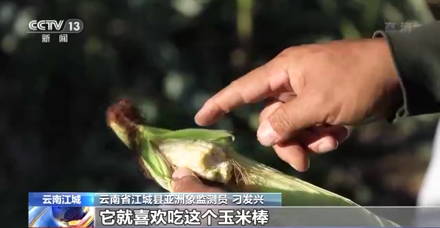 *雲南省江城縣亞洲象監測員刁發興:*這個是昨天晚上剛剛到,剛吃的這一片,因為象羣有點大,有20多頭,這片大概吃了兩畝多點。你看它把皮剝了,吃裏面的芯。這比較嫩、甜,它就喜歡吃玉米棒。它吃不上還踩踏,也浪費了。