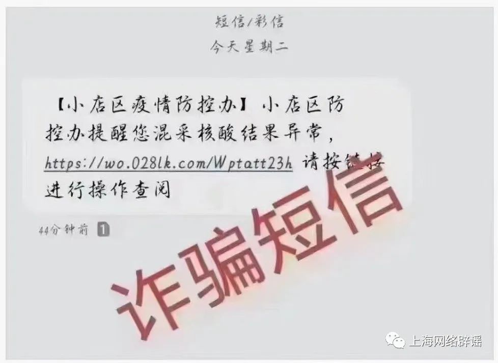 近日,有網友向上海闢謠平台提供一張短信截屏,希望求證真偽:短信稱用户核酸混檢異常,可點擊鏈接操作查詢。經上海闢謠平台查證,此鏈接誘導用户填寫個人財產信息,存在個人信息泄露的風險 。上海闢謠平台提醒,上海市防控辦發送的正規短信內容不會有鏈接內容和其他操作要求,只會提醒市民憑短信就近去做單人單管採樣。不要輕易點擊不明鏈接或掃描可疑二維碼,謹防誤進釣魚網站。