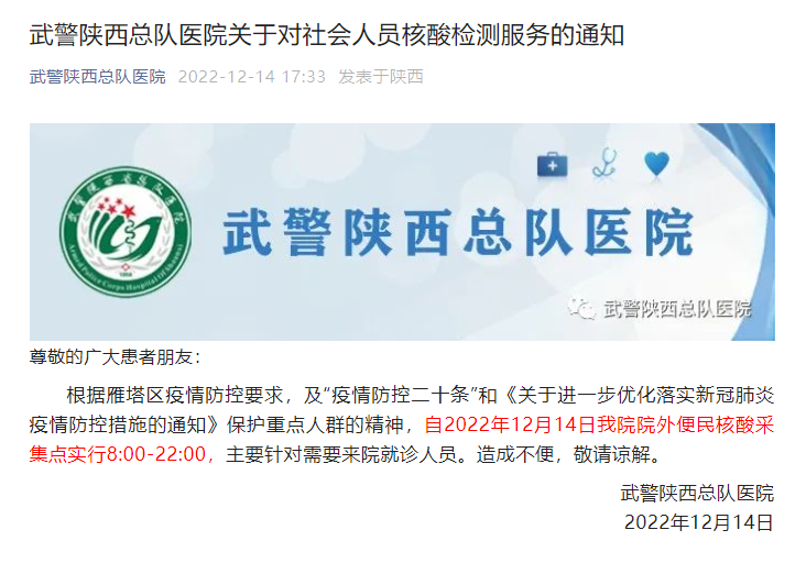 2022年12月14日 武警陝西總隊醫院 關於對社會人員核酸檢測服務的通知