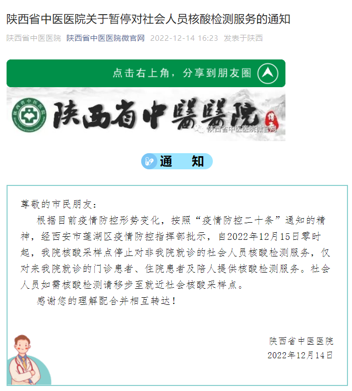 根據目前疫情防控形勢變化,按照“疫情防控二十條”通知的精神,經西安市蓮湖區疫情防控指揮部批示,自2022年12月15日零時起,陝西省中醫醫院核酸採樣點停止對非陝西省中醫醫院就診的社會人員核酸檢測服務,僅對來陝西省中醫醫院就診的門診患者、住院患者及陪人提供核酸檢測服務。社會人員如需核酸檢測請移步至就近社會核酸採樣點。