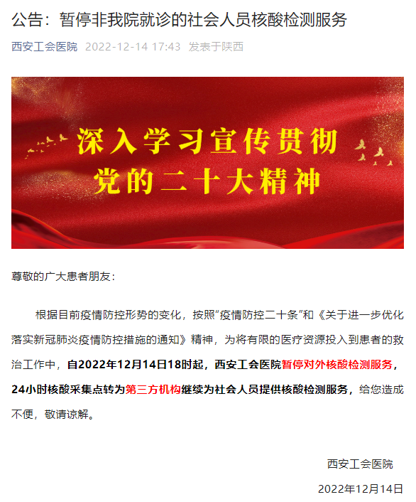 根據目前疫情防控形勢的變化,按照“疫情防控二十條”和《關於進一步優化落實新冠肺炎疫情防控措施的通知》精神,為將有限的醫療資源投入到患者的救治工作中,自2022年12月14日18時起,西安工會醫院暫停對外核酸檢測服務,24小時核酸採集點轉為第三方機構繼續為社會人員提供核酸檢測服務,給您造成不便,敬請諒解。