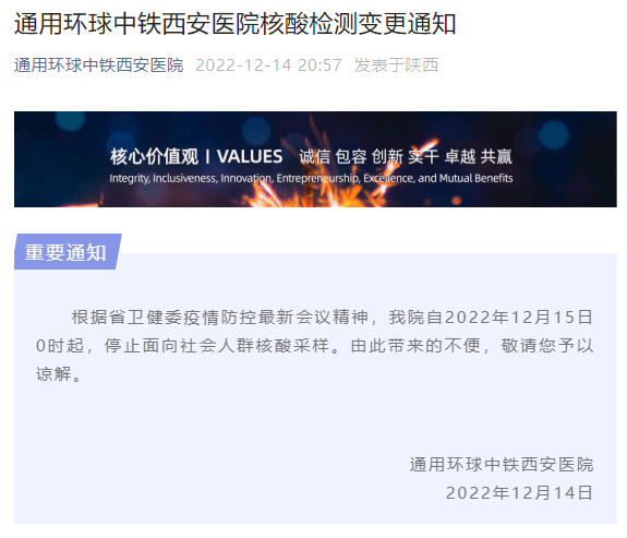 2022年12月14日 通用環球中鐵西安醫院 核酸檢測變更通知