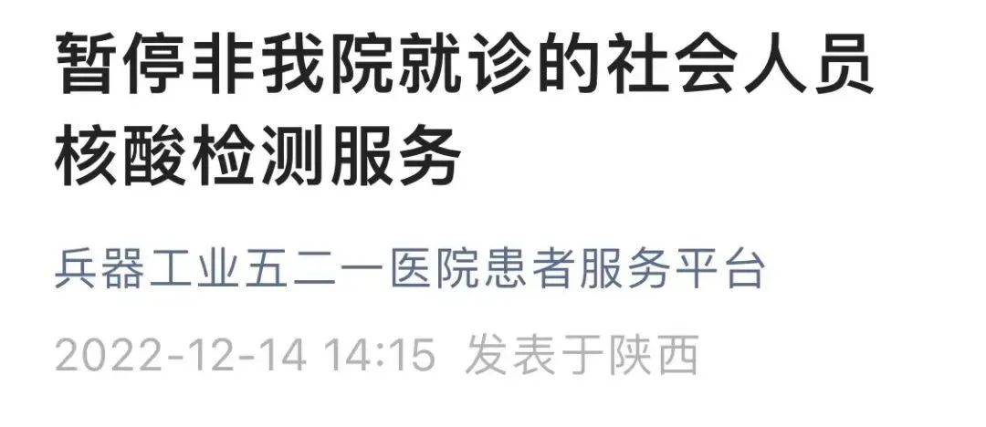 2022年12月14日 兵器工業五二一醫院 暫停非本院就診的社會人員核酸檢測服務