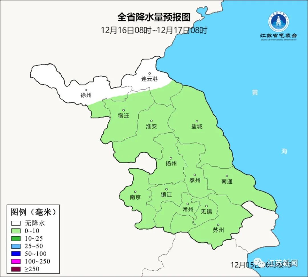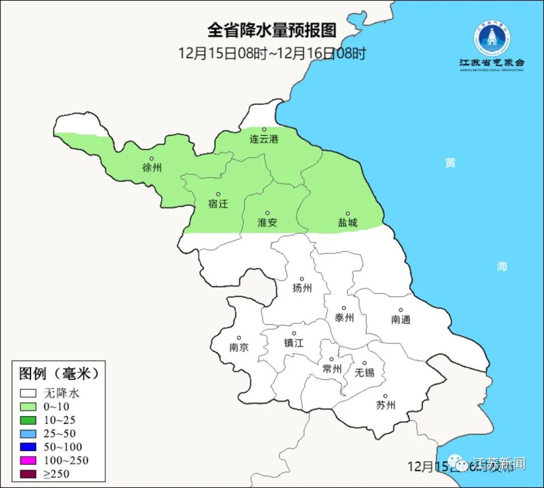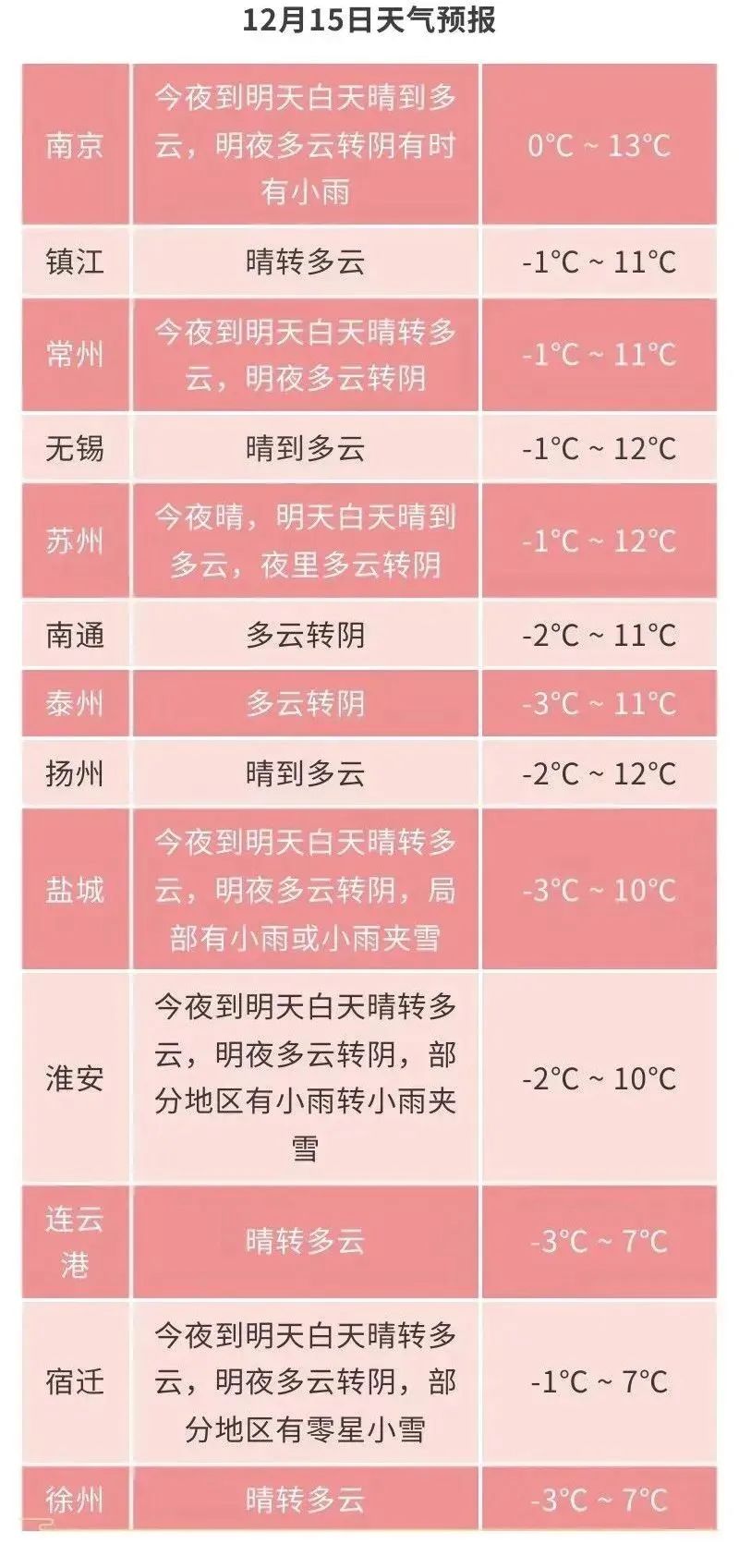 *12月15日08時至12月16日08時:*淮北地區多雲轉陰有小雨夾雪或小雪,其他地區多雲轉陰。最高温度沿準和淮北地區7~8℃,其他地區11℃左右;最低温度淮北地區-1~-2℃,蘇南地區2℃左右,其他地區0~1℃。全省偏南風轉東北風,風力3~4級並逐漸增強到4~5級陣風6級。