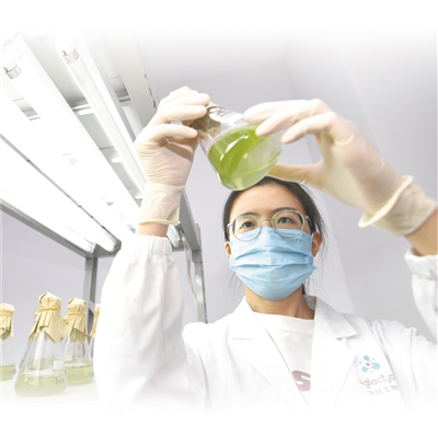 貴州省貴陽市南明智能製造產業園,技術人員正在對育種階段的藻細胞進行定期搖瓶。