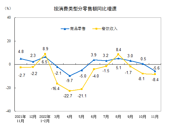 按消費類型分,11月份,商品零售34180億元,同比下降5.6%;餐飲收入4435億元,下降8.4%。1—11月份,商品零售359406億元,同比增長0.5%;餐飲收入39784億元,下降5.4%。