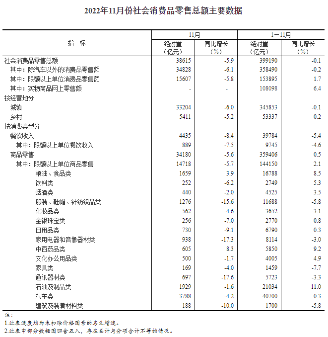 11月份,社會消費品零售總額38615億元,同比下降5.9%。其中,除汽車以外的消費品零售額34828億元,下降6.1%。